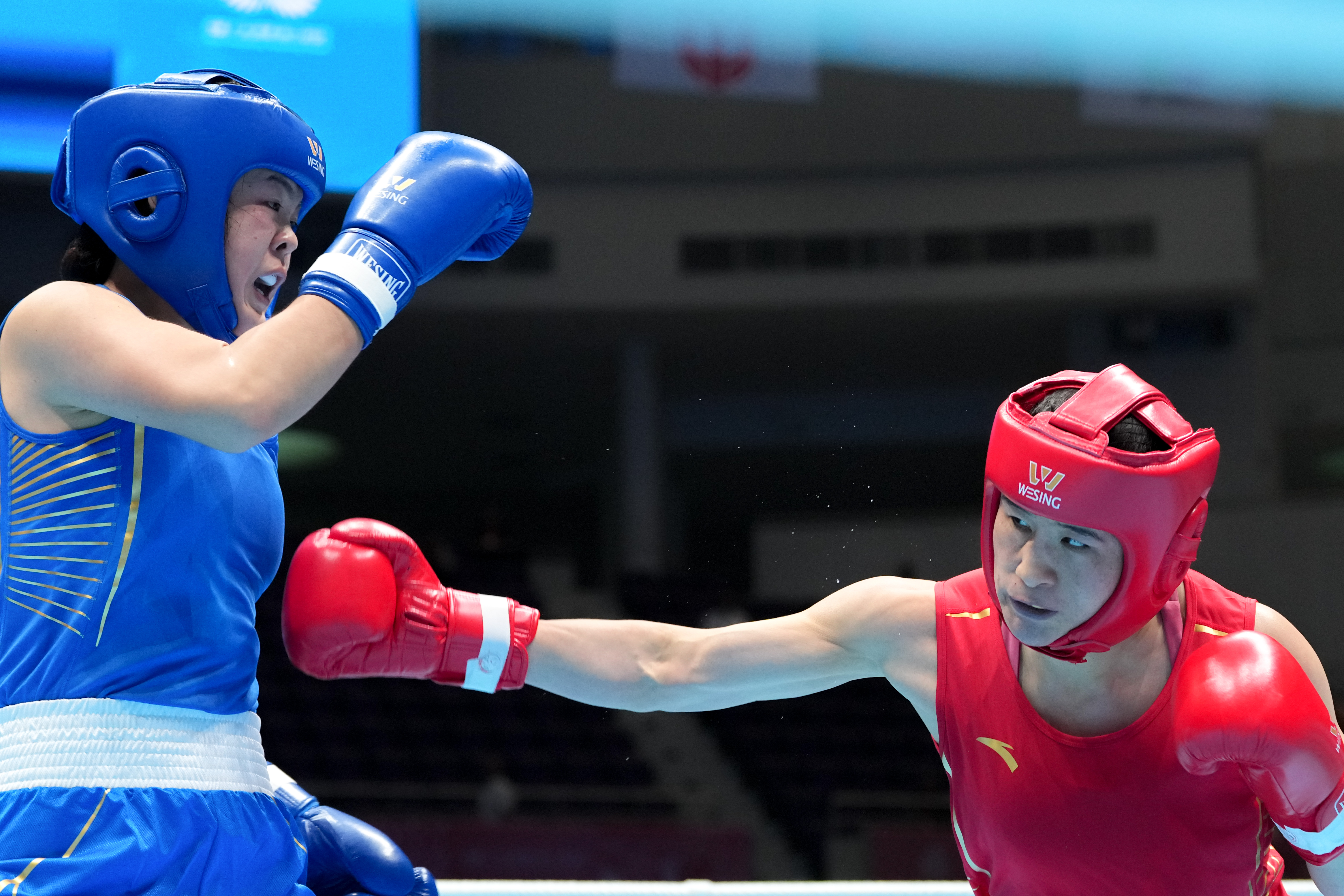 5日,在第十五届全国运动会拳击项目比赛中,巴黎奥运会冠军、内蒙古队李倩5:0击败上海队范悦,晋级女子75公斤级八强。 11月5日,李倩右)与范悦在比赛中。新华社记者 彭奕凯 摄本
